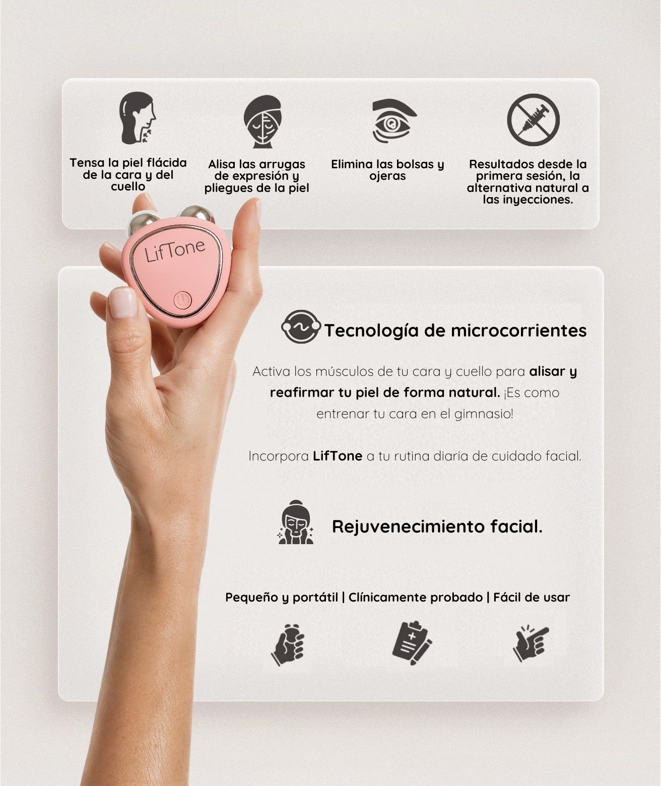 Transforma tu piel con LifTone, el revolucionario dispositivo de microcorriente que combate los signos del envejecimiento y te ayuda a lograr una piel más firme, radiante y joven.