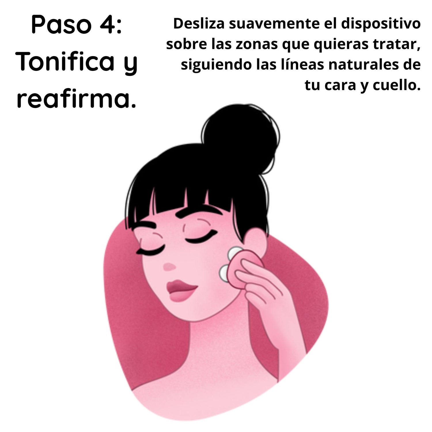 Paso 4: Tonifica y levanta. Desliza suavemente el dispositivo por las áreas que deseas tratar, siguiendo las líneas naturales de tu cara y cuello.